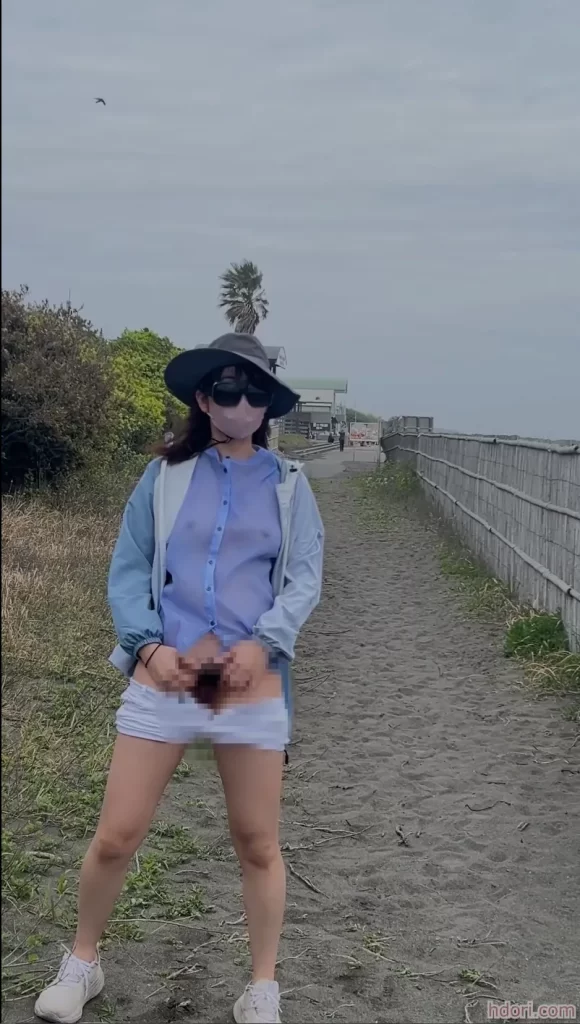 サーファーみたいな人が後ろの方にいる砂の道で服を着たままオマンコ広げ